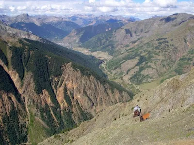 This was the steepest face we have hiked on, this summer. My little dog enjoys scaring me by scampering by me, on the outside of course, and sending small rocks rolling down the side of the mountain. The outside corners of the trail reminds one of Roadrunner and Coyote cartoons, where cars go leaning out over the edge as they round the corner.