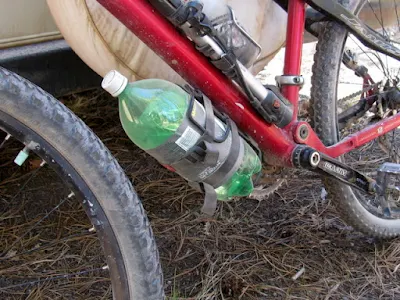 But at least in one department, victory has been achieved. Recall my advertisement for the Salsa "Anything" bottle cage for bicycles. I've put some rough miles on it by now, and it appears dependable. Just think, 2 liters of agua for me and the dawg.