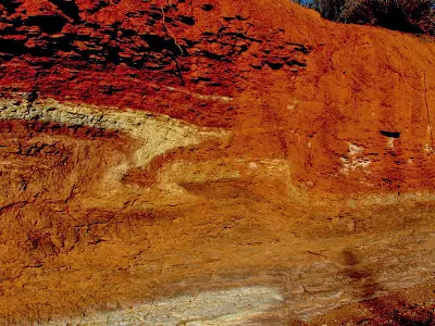| Vertical wall of a red sandstone arroyo. What could cause such a weird bend in the whitish layer? |