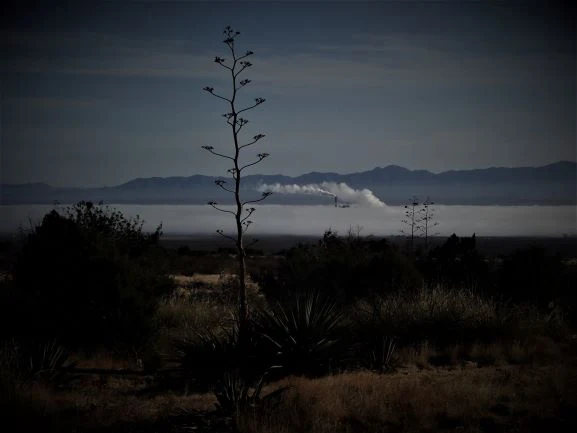It was the Willcox Playa, a rare and dry lake. There are visible clouds of dust, moiling and turbulent, above the playa. It is an infamous place with its own mystique, like Edgar Allen Poe's "Maelstrom," interstellar dust, or the 'force field at the edge of the galaxy,' of some science fiction flick. It is impossible to photograph.